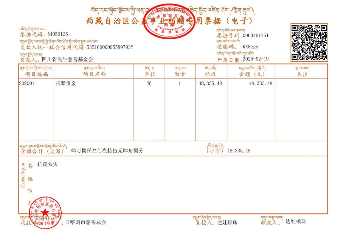 2025年1月7日9时5分,西藏日喀则市定日县发生6.8级地震,造成重大人员伤亡,大量房屋倒塌。四川省民生慈善基金会在第一时间启动应急预案,对接灾区需求,同时通过线上线下向社会各界爱心企事业单位、团体及爱心人士发出倡议,希望各界积极发扬优良传统,众志成城,向灾区群众伸援手、献爱心,捐款捐物,支援西藏抗灾救灾,共渡难关!