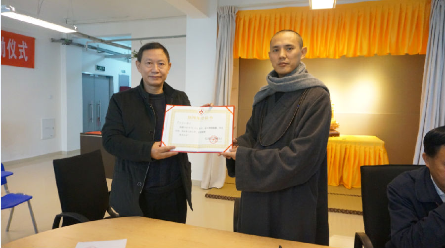 四川省民生慈善基金会副理事长杨秀华向荥经县云峰寺颁发捐赠荣誉证书